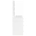Pull out all the stops to set up a stylish and functional space for your makeup and prep, adding this three-piece white finish vanity set to a modern bedroom. Wood products construction with mirrored drawer fronts and a gray upholstered stool cushion team up to maintain an easy palette with versatility. Find space in nine drawers to stash implements, cosmetics, and accessories. Charming crystal knobs and a felt-lined top drawer add to a list of fab features. The marquee element of this set is a mirror surrounded with bulbs to offer helpful lighting as it enhances a chic design. Key Features: • Three-piece white finish vanity set, perfect for a modern bedroom setup • Constructed from wood products, featuring mirrored drawer fronts for a sleek look • Comes with a gray upholstered stool cushion, providing comfort and style • Offers ample storage with nine drawers, including a felt-lined top drawer, all adorned with charming crystal knobs • Includes a mirror surrounded by bulbs, providing helpful lighting and enhancing the chic design