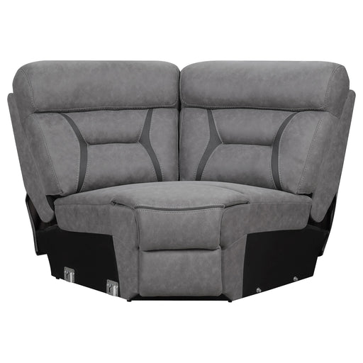 This left-arm facing power reclining loveseat offers premium comfort and functionality within a modular sectional. Upholstered in soft grey microfi...