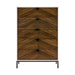 Thoroughly modern with a nod to Mid-Century design, from its clean lines to bold accents, the Oslo Collection perfectly defines your preference for inspired design. V-match pattern acacia veneer fronts the drawers of the chest, with a walnut finish that highlights the grain, providing distinct contrast to the bright white finish of the piece. The intersection of the drawer front’s routed detail is centered by square black inset hardware, the combination a stunning detail. Black-finished metal legs provide support to the chest. 38 x 18 x 56H