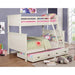 This item takes a slightly more traditional approach to the bunk bed genre. The panel styled head and foot boards have a crowned top and vertical planking that carries a sophisticated air. An attached ladder and sturdy guard railing adds safety. The matching trundle features a drawer face edifice so you can conceal another mattress under the lower bed platform. This collection is all about space saving design and a touch of country charm that both you and your kids will love.
