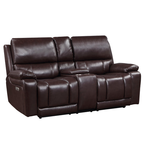 New ClassicJOSHUA LEATHER CONSOLE LOVESEAT W/ DUAL RECLINERS-DK BROWN