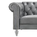 Introducing the Emma living room set - the perfect combination of style and comfort for your home. This set includes a sofa, loveseat, and chair, all featuring a stunning crystal tufted back that adds a touch of glamour to any space. Made with 100% polyester, these pieces are durable and easy to maintain. The set is available in three sleek colors - blue, black, and gray - so you can choose the one that best matches your decor. Upgrade your living room with the luxurious Emma set and enjoy hours of relaxation and entertainment.